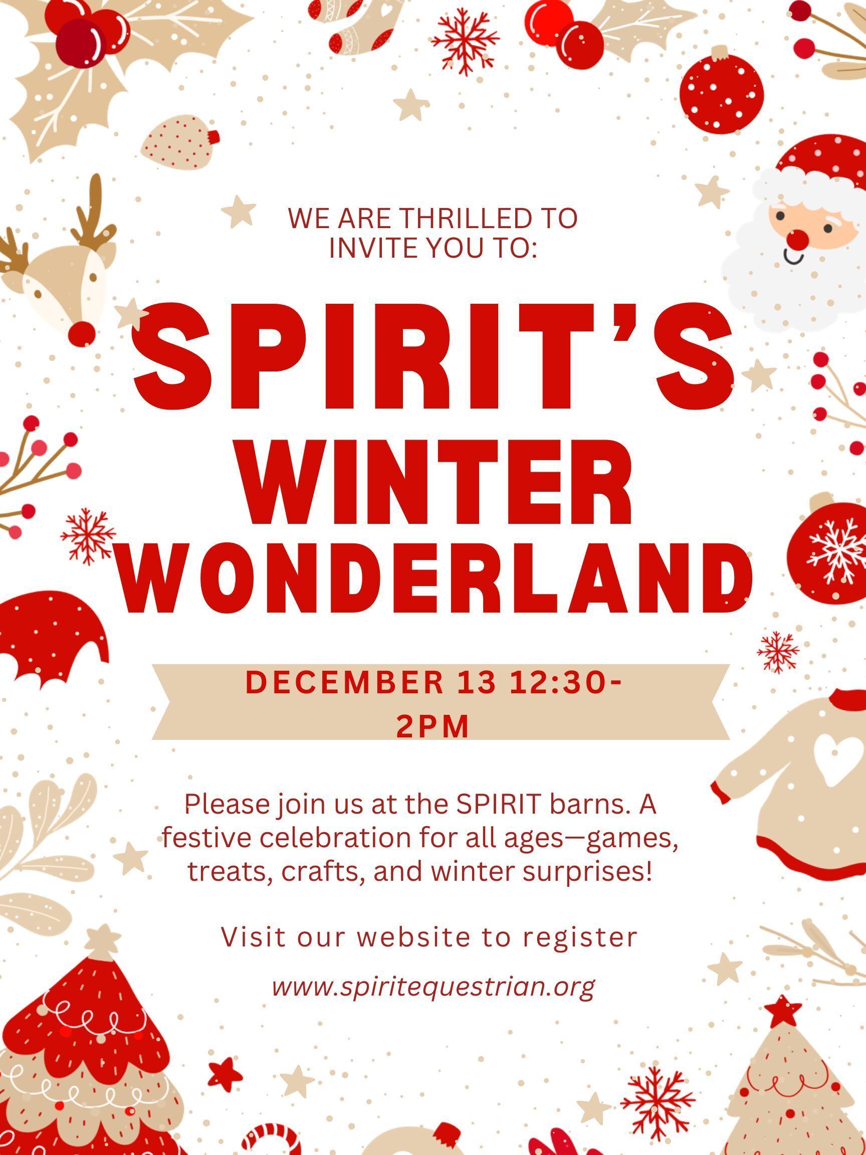 Step into the magic of the season at SPIRIT’s Winter Wonderland Party! Join us for an afternoon of fun at the farm with our beautifully decorated barn, festive horses dressed in their winter best, and plenty of seasonal cheer for all ages to enjoy. Guests can create winter-themed crafts, enjoy sweet treats, and spend time with our incredible horses in a joyful, welcoming atmosphere.